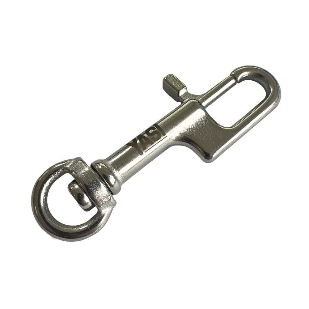 Durable and corrosion-resistant, the YASI Single-Ended Technical Boltsnap is crafted from stainless steel for reliable performance in harsh environments. Its smooth, single-handed operation makes securing gear, hoses, and accessories quick and easy, while its robust construction ensures a secure lock under load - perfect for technical diving and demanding underwater applications. The boltsnap is available in 84mm and 110mm long versions. Specifications: Material: 316 Stainless Steel Gate Opening: 15 mm Design: Single-ended, spring-loaded gates Finish: Polished corrosion-resistant Use: Diving, marine, outdoor, and general gear attachment
