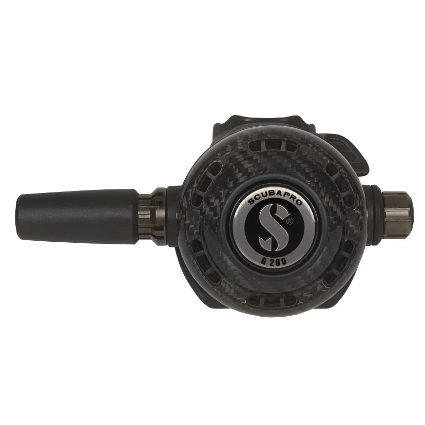 This premium system features SCUBAPRO's MK19 EVO, finished in a special ultradurable Black Tech coating, along with an upgraded version of SCUBAPRO's most popular tech diving second stage, the G260. While retaining its large diaphragm, internal metal components and high-flow exhaust valve for excellent breathing sensitivity and resistance to freezing, the G260 Carbon BT ratchets up its ruggedness and durability with the addition of a carbon fiber front cover.